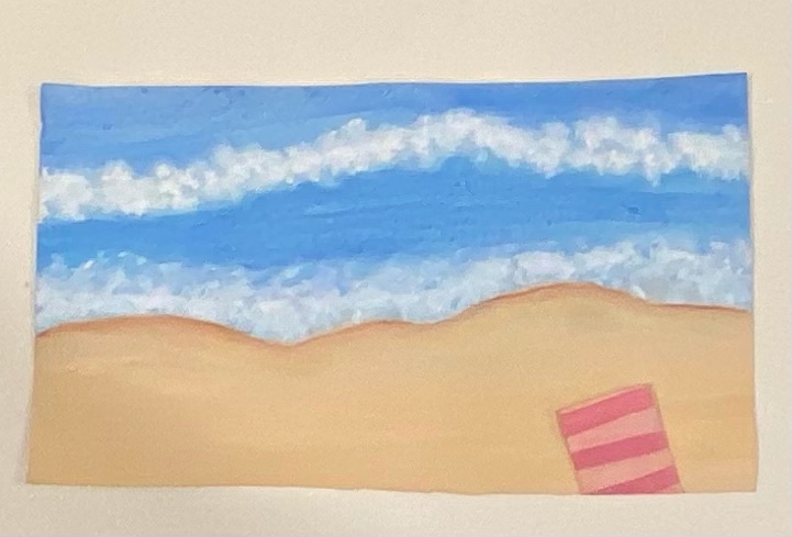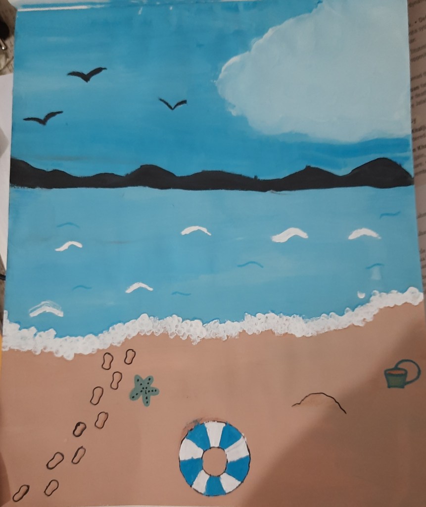 It is a painting of a beach. The painting is a “bird’s eye view” of an empty, peaceful beach with a sunbathing mat just along the shore. Have a lazy day on the beach! – Manya.